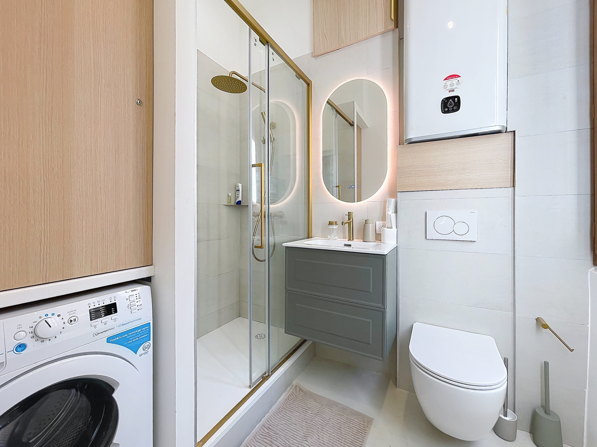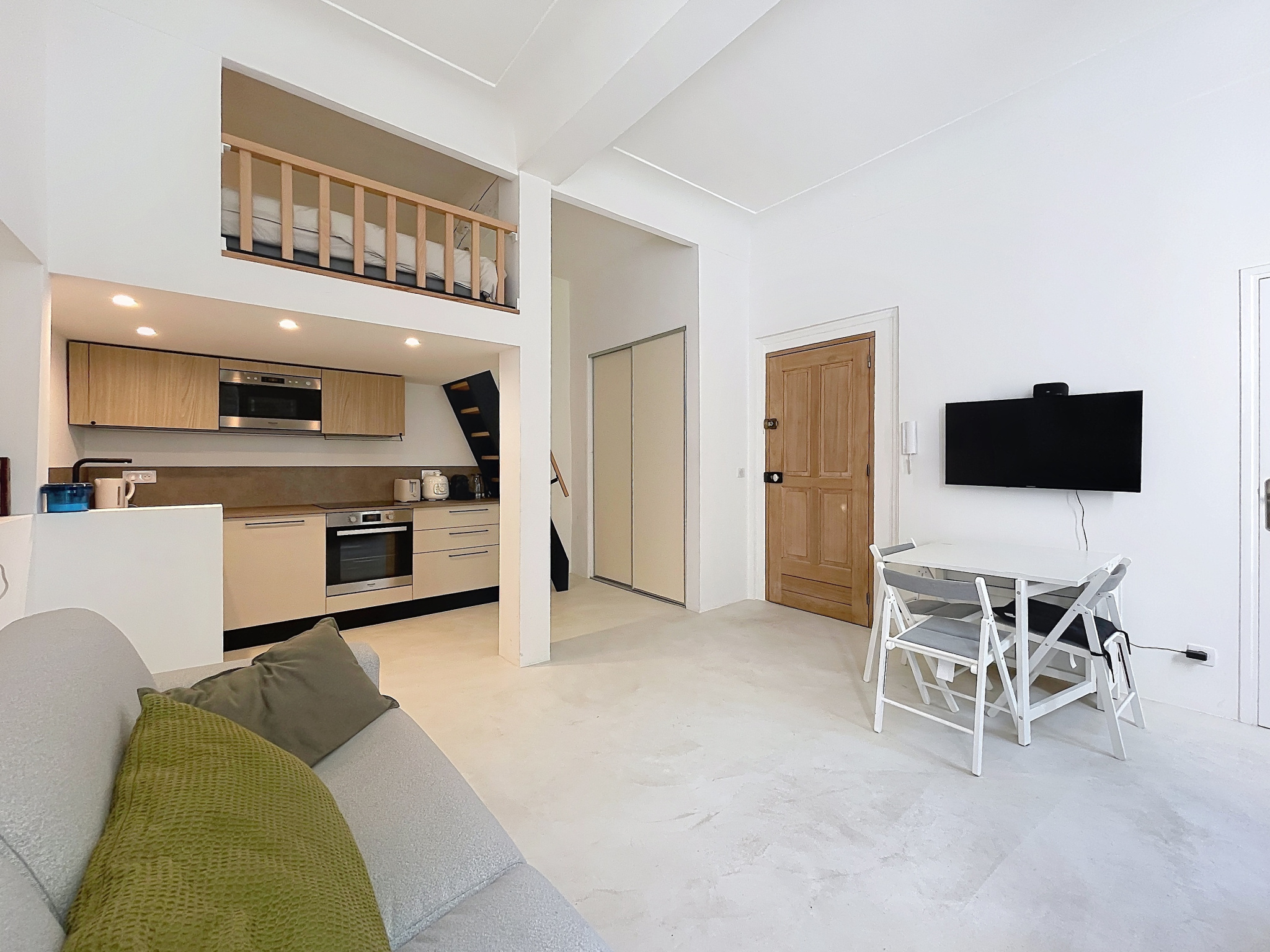 Au 1er étage d’un immeuble typique récemment ravalé, il offre un bel espace de vie lumineux avec un magnifique mur en pierre apparente, alliant authenticité et modernité. La cuisine ouverte, entièrement équipée, s’intègre parfaitement au séjour pour un confort optimal.