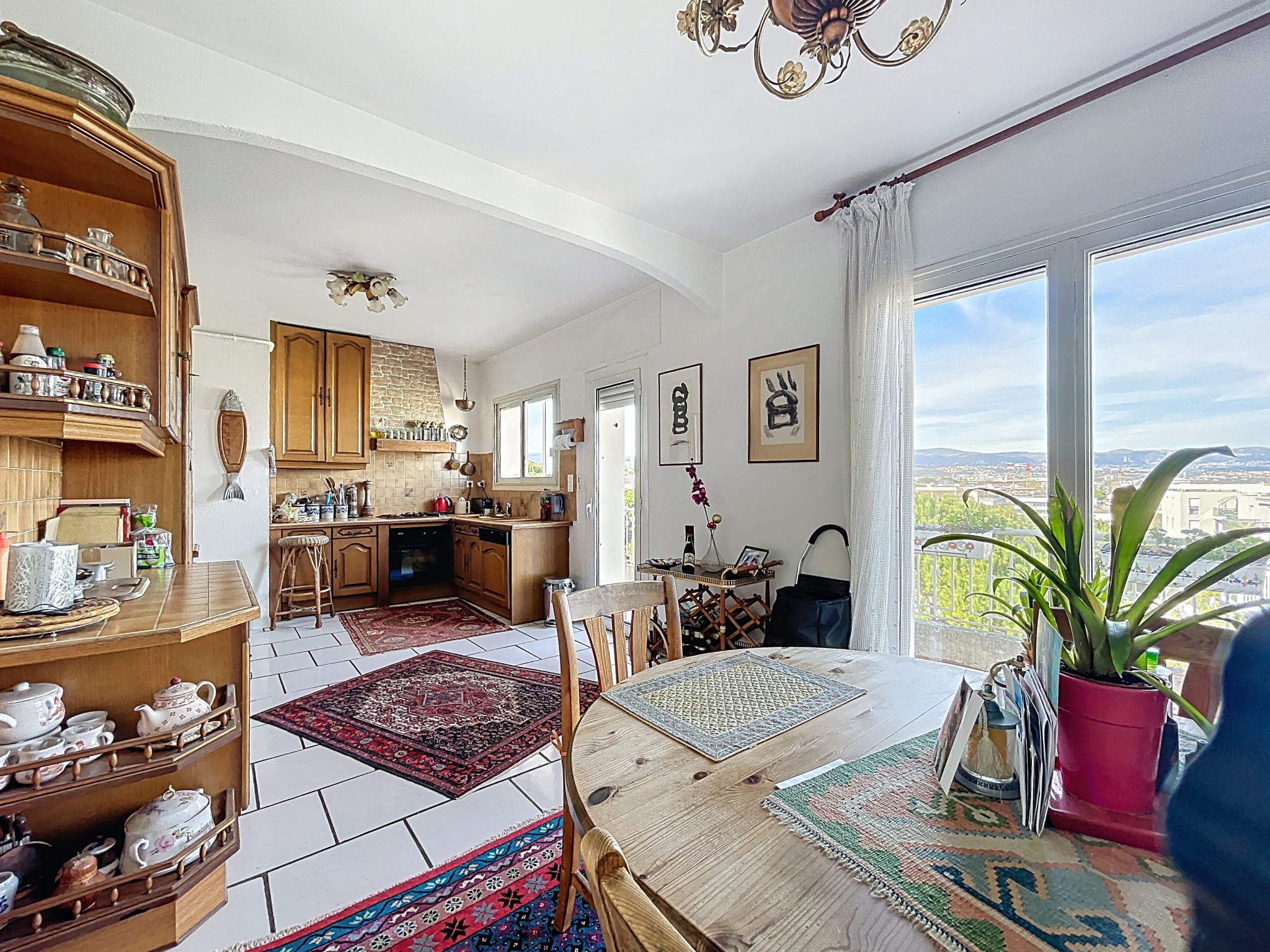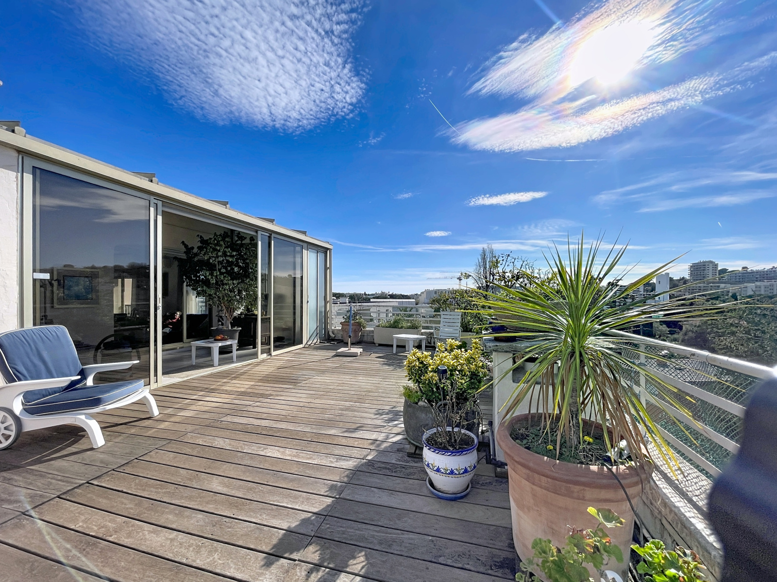 Cet appartement bénéficie d'une triple exposition ce qui le rend très lumineux. Il se compose d'une entrée, d'une salle à manger avec cheminée donnant sur une terrasse exposée Sud, d'un salon avec véranda qui ouvre sur la grande terrasse orientée ouest, d'une spacieuse cuisine avec balcon orienté nord, d'une chambre avec salle d'eau et WC, d'une 2ème chambre avec salle de bains, 2 WC indépendants. Nombreux rangements.