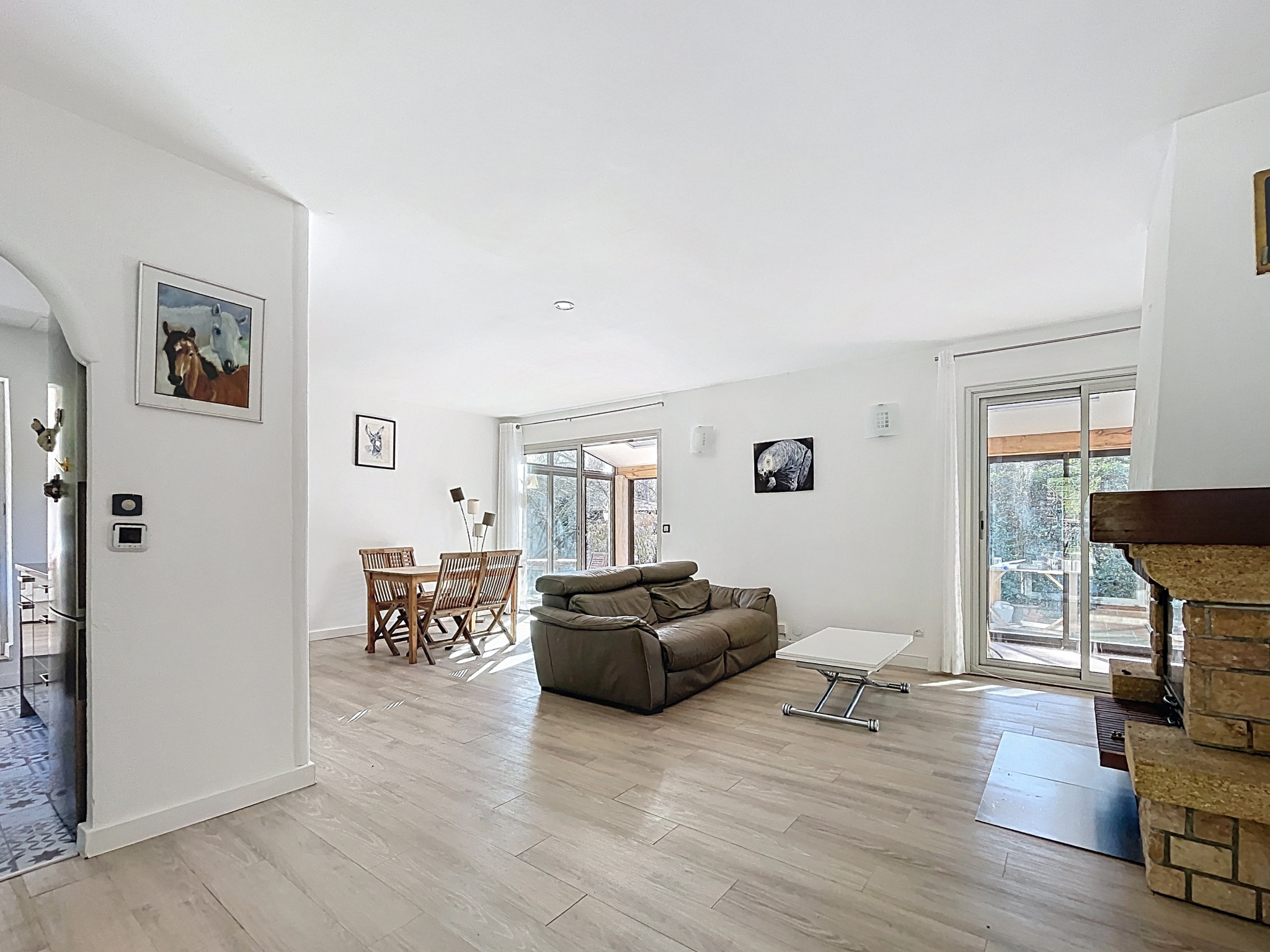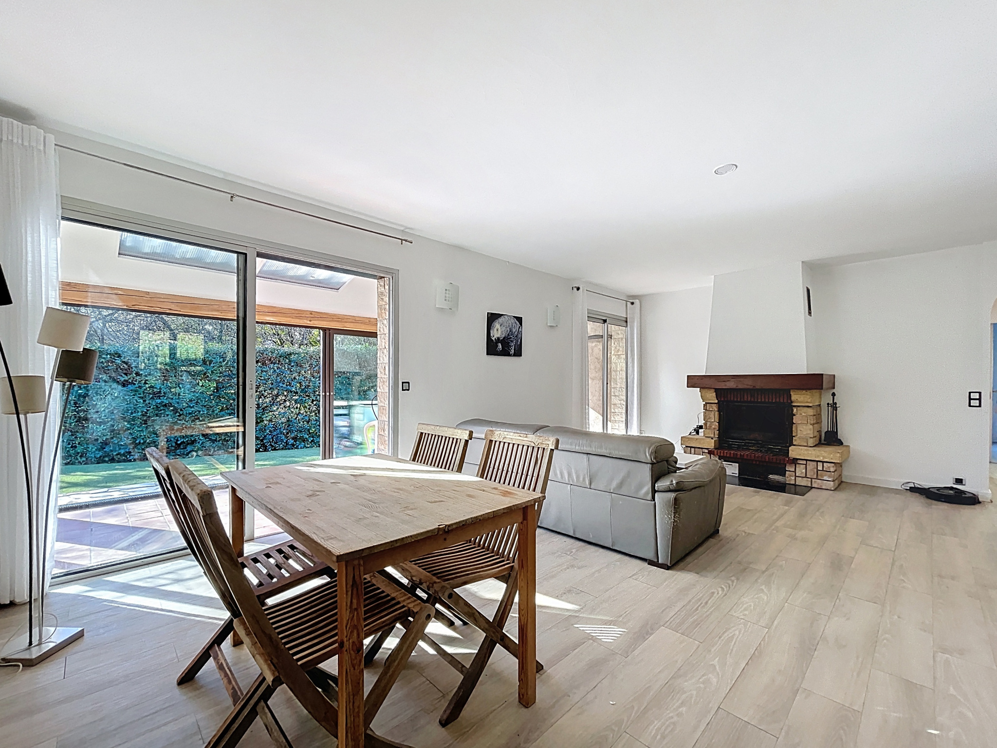 Située au calme absolu et sans vis-à-vis, cette villa individuelle de plain-pied offre un cadre de vie privilégié avec un bel espace de vie lumineux comprenant séjour salon avec cheminée ouvert sur une agréable terrasse couverte et fermée (espace barbecue) idéale pour en profiter toute l’année, une cuisine américaine conviviale et fonctionnelle complète cet espace.