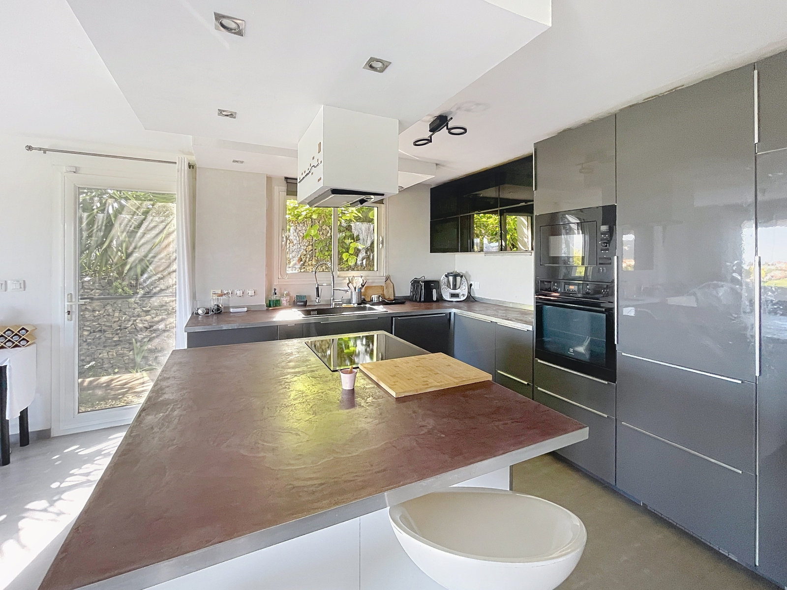 Au niveau Rez de Jardin: un séjour avec salle à manger, une cuisine américaine entièrement équipée, une chambre de maître en suite, avec sa salle de bains et son dressing, toilettes invités et grande terrasse profonde avec une vue dégagée jusqu'à la mer.