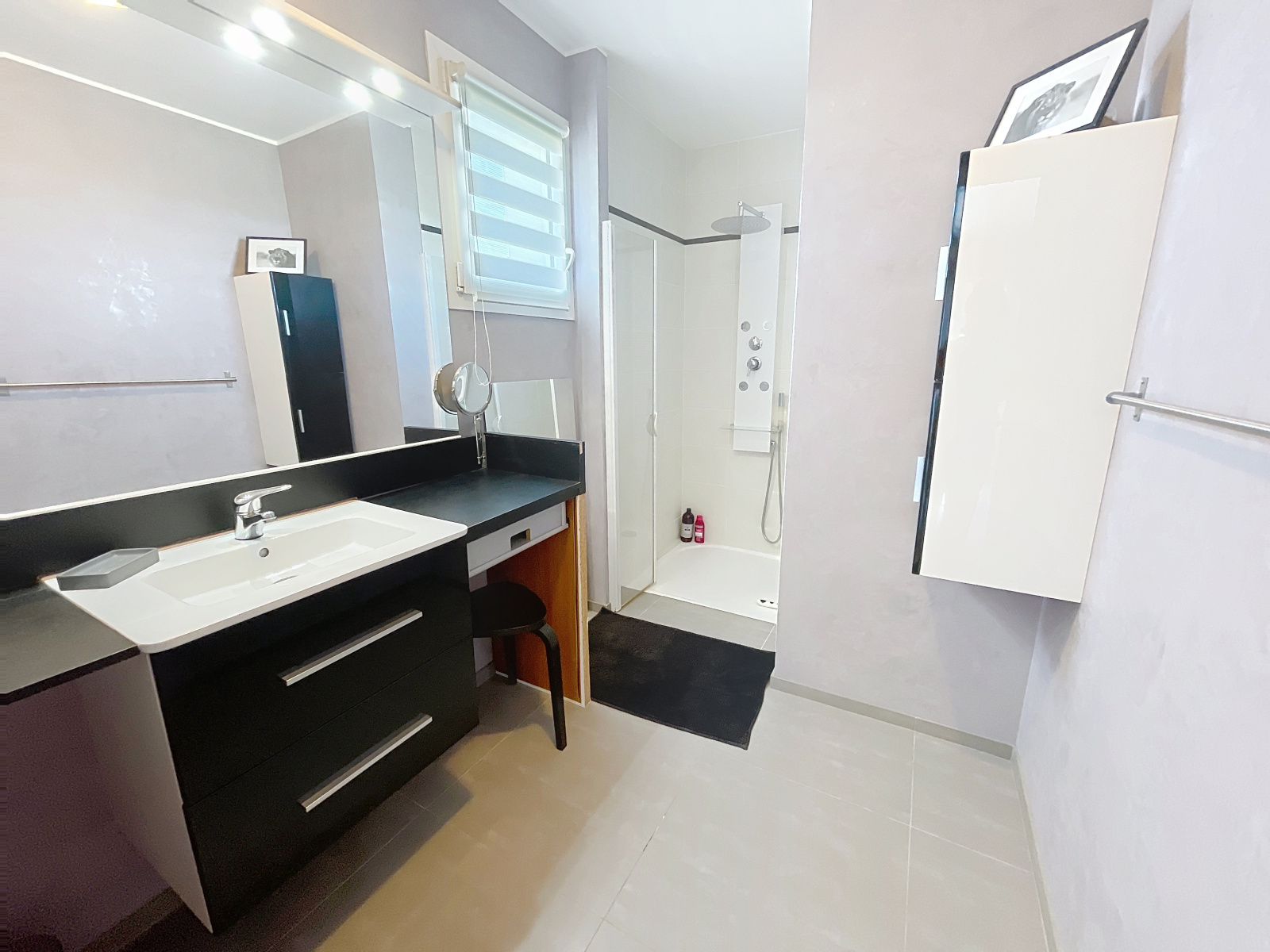 Au niveau Rez de chaussée: deux chambres en suite, wc indépendant, et garage ainsi que des parkings extérieurs