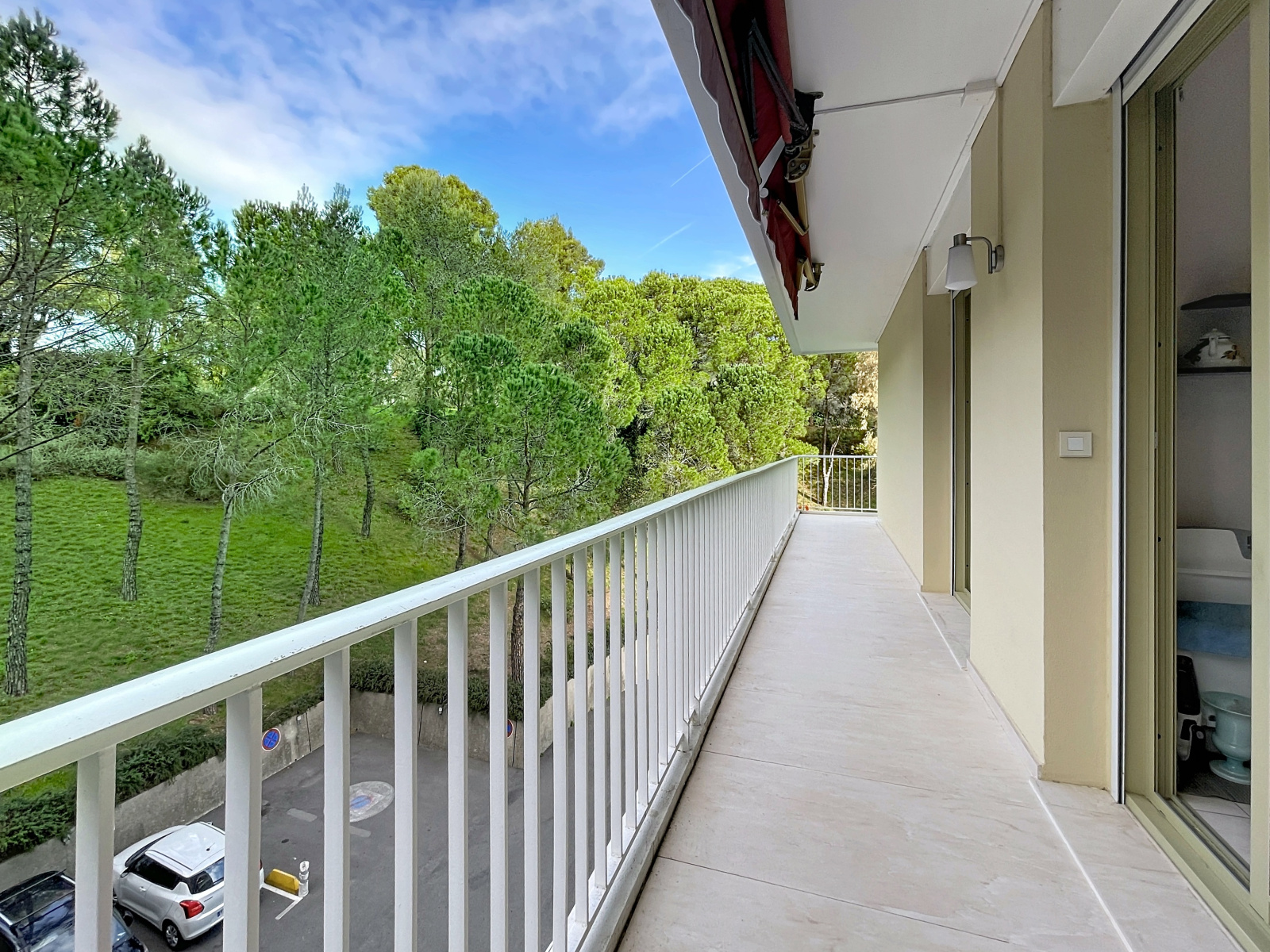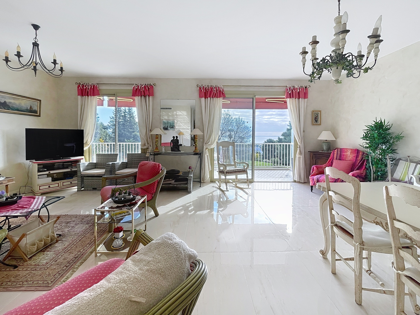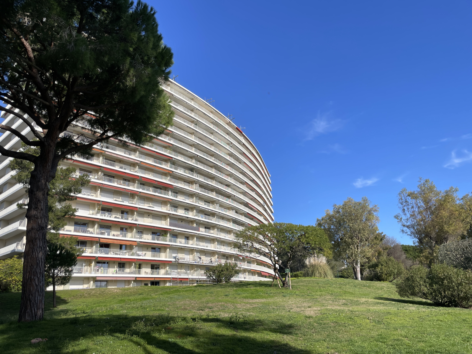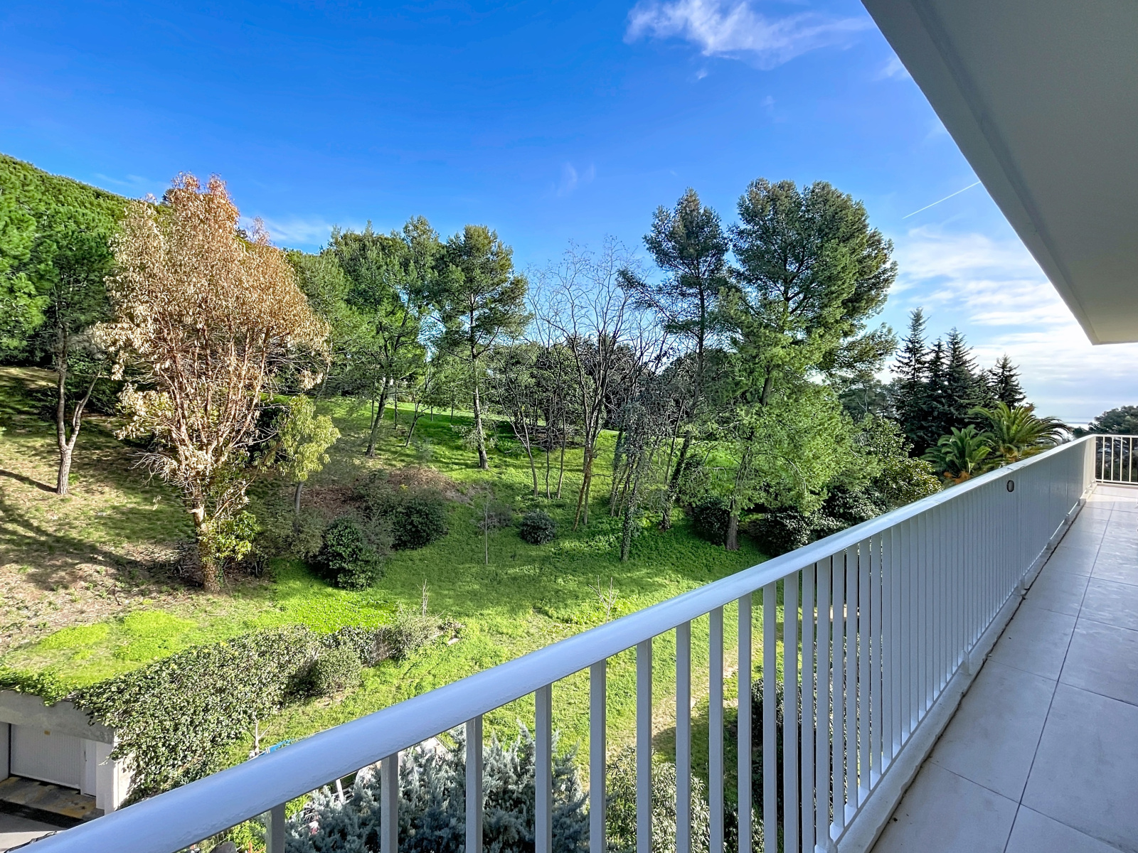EXCLUSIVITE Domaine du Loup. Résidence avec parc de 22 hectares, oliveraie centenaire, piscine olympique, tennis, club house avec restaurant, cadre verdoyant, au calme, service de bus de la ville, à 800 m de la gare. Magnifique appartement traversant d'angle 4 pièces développant 118m2 (LC) en excellent état, séjour avec vue mer de 40m2, cuisine équipée, buanderie, 3 chambres et 2 salles de douche, wc indépendant, belle terrasse de 53m2 avec VUE MER et verdure.