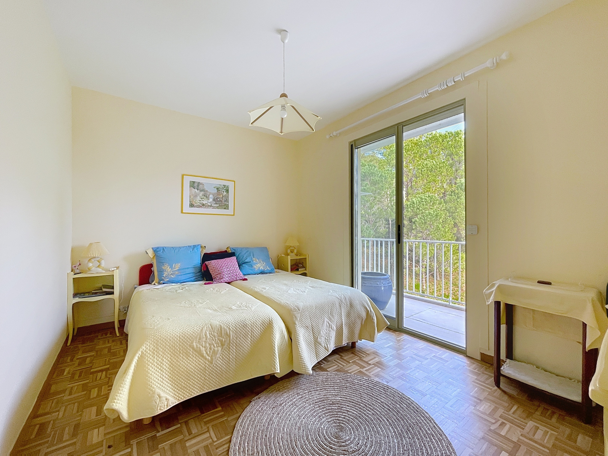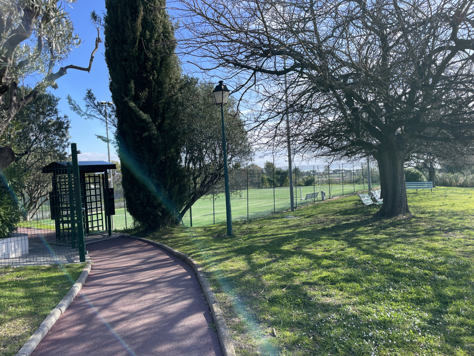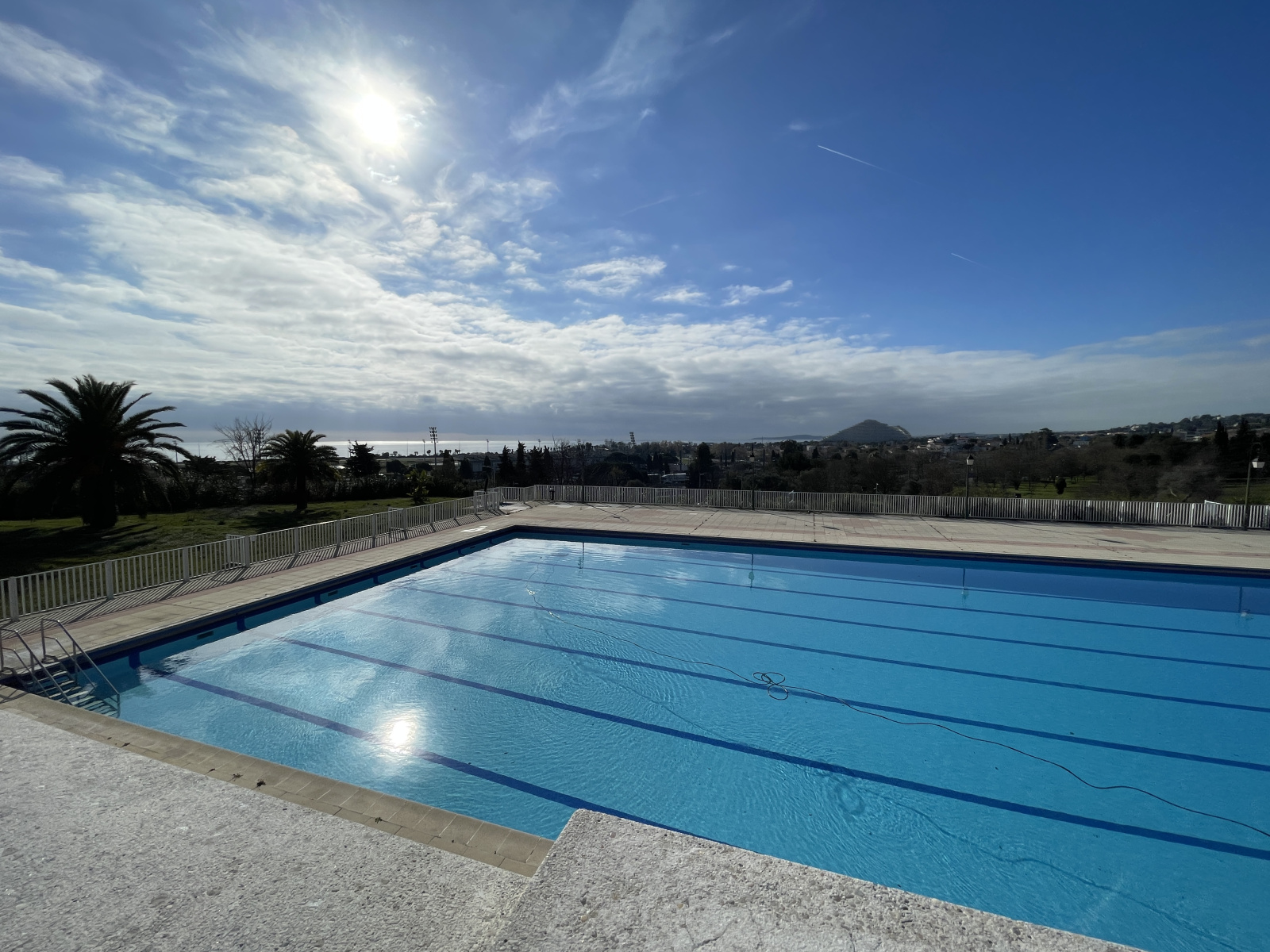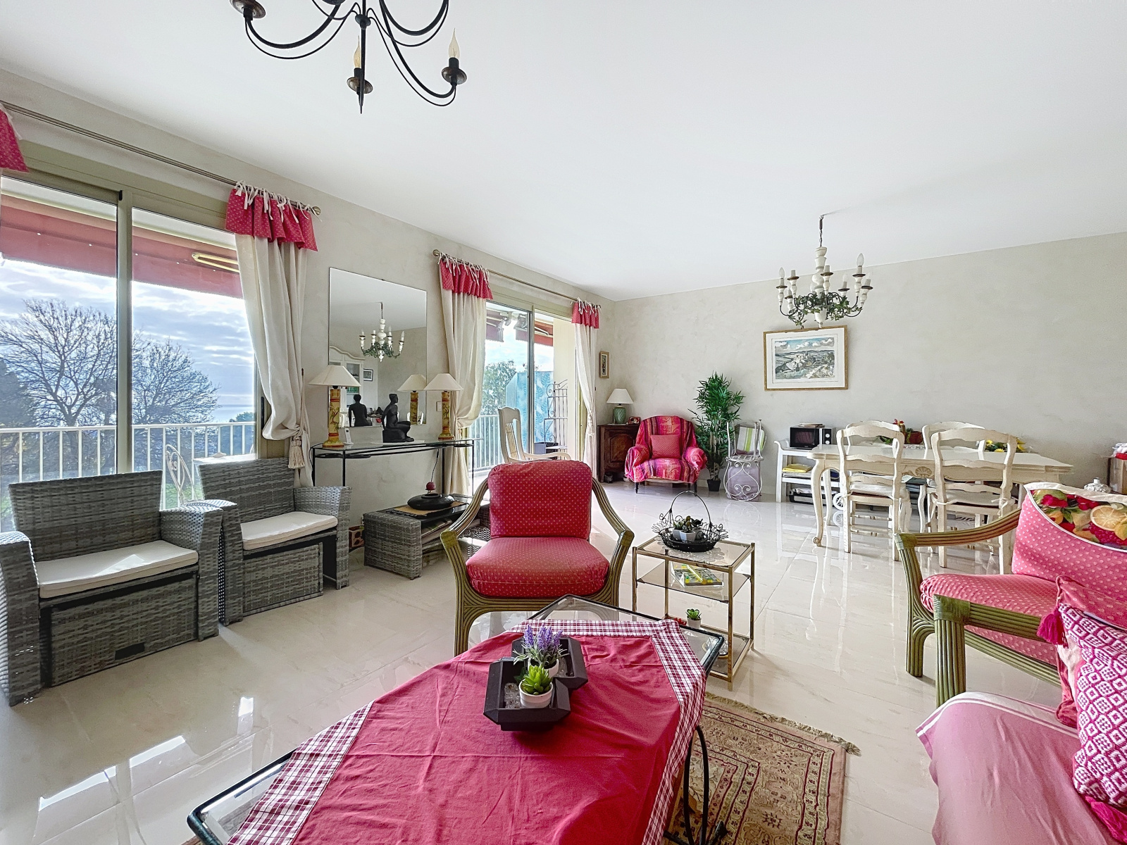 EXCLUSIVITE Domaine du Loup. Résidence avec parc de 22 hectares, oliveraie centenaire, piscine olympique, tennis, club house avec restaurant, cadre verdoyant, au calme, service de bus de la ville, à 800 m de la gare. Magnifique appartement traversant d'angle 4 pièces développant 118m2 (LC) en excellent état, séjour avec vue mer de 40m2, cuisine équipée, buanderie, 3 chambres et 2 salles de douche, wc indépendant, belle terrasse de 53m2 avec VUE MER et verdure.